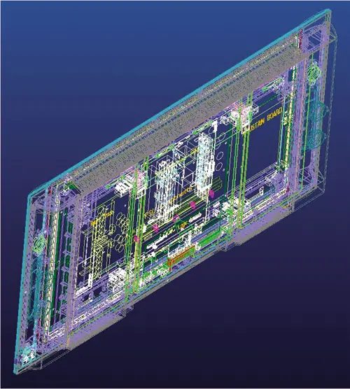 Figure 4. CFD model of FTV monitor.The CFD simulations used in the implementation phase are performed in more detail, especially the power supply down to the component level. Accurate power dissipations of the PSU components are unavailable at this time, so best guess values are used, and the model is updated once the first PSU board measurements are available. An example of the results of the CAD-CFD transfer is shown in Figures 3 and 4. Calculated temperature and flow fields are shown in Figure 5.