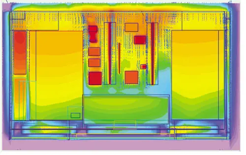 Figure 5. Calculated temperature and flow field of FTV monitor.Again, a risk assessment is performed on the component level for the critical module. The result of this risk assessment shows that of the thirteen components in the PSU, nine are not critical, the three heatsinks are critical, and the local board temperature at the location of the NTC (Negative Temperature Coefficient resistor) is much too hot and has a risk of solder failure. Subsequent calculations, in which the working point of the NTC was determined with greater accuracy, lead to an actual lower dissipation with corresponding lower temperatures in the NTC, and layout modifications near the NTC leads further reduced the associated thermal risk.