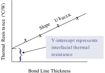 TIM is measured using a series of test coupons with various TIM thicknesses, a line can be fitted to the resultant data.