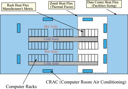 With the arrangement of DP equipment in rows within a data center there may be zones where all the equipment within that zone dissipates very high heat loads. This arrangement of equipment may be required in order to achieve the performance desired by the customer. These high performance zones (shown in Figure 2) can provide significant challenges in maintaining an environment within the manufacturers specifications. Figure 3 shows trends for these high heat flux zones using the equipment power trends of Figure 1. In contrast, a data center that employs a mix of computer equipment with lower power racks is also shown in Figure 3.