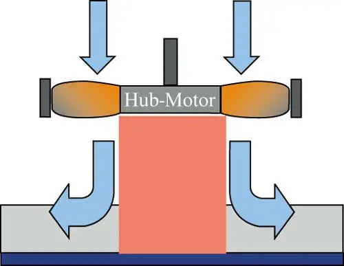 Small hub-motor designs can partially block the air flow to the hottest area: the heat sink. However, they do not generate enough power to achieve the necessary fan performance.