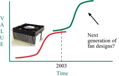 Thus, cooling the next generation of electronic devices will necessitate a new look, perhaps even a revolution, in the air delivery methods afforded through fan design. Attaining this goal will require the industry to migrate from today’s technology value curve (the red line in Figure 5) to the green curve, signifying the next generation of fan designs. It is therefore is incumbent upon the fan industry and the thermal design community to leverage the old technology and produce the next generation of air movers.