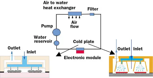 Figure 5. A closed loop liquid cooling solution. The module at the lower left employs liquid jet impingement cooling. The module at the lower right uses spray cooling and represents an SGI Cray design [3].Different packaging schemes may put these cooling systems in other categories, but, in general, the use of closed liquid loops distinguishes these cooling systems from others. The predecessor for this cooling technique and perhaps the first commercial introduction of closed liquid loops in modern electronics (beyond vacuum tubes) is the IBM Thermal Conduction Module (TCM). In this system, a series of spring loaded cylinders conduct the heat from chips to the cooling chamber. Such cooling solutions are currently used in high priced, large capacity computers that can allow for the types of packaging and maintenance required to run these system.