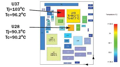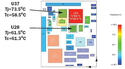 If the board placement is frozen, there are still several potential solutions, such as attaching a heat sink, adding thermal vias in the board below the components, or increasing the copper content locally to improve the heat spreading in the board. In this case, the option of transferring the heat into the board does not look like a viable solution. The next most cost-effective solution is the addition of heat sinks. In cost sensitive designs such as this, custom or exotic thermal solutions may kill the project. This makes it critical for an engineer to qualify a design early and to ensure that it can be adequately cooled with low cost heat sinks commercially available on the market. In an effort to reduce costs, the same 21 by 21 mm pin fin heat sink is placed on both U37 and U28. The thermal resistance between the component and the heat sink is reduced by introducing a thermal interface material. The results of the analysis including the heat sinks (Figure 2b) show that none of the components are above the junction temperature limit of 90°C.