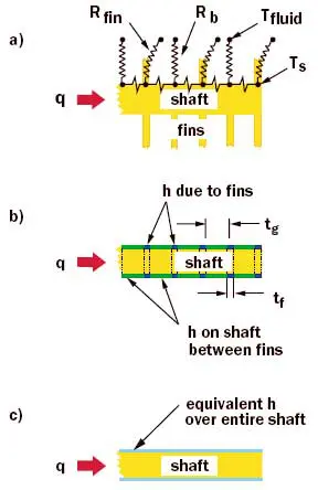 Figure 2. Alternative model approaches: a) discrete thermal resistances, b) multiple differential equations, c) equivalent h approach.So, not only will the radial fins exhibit a thermal efficiency, but so will the shaft to which they are attached. One could attempt to set up and solve the differential equations governing convection and conduction for each region of the shaft. This would result in a differential equation for each section of the shaft with an appropriate heat transfer coefficient applied as shown in Figure 2b. Setting up and solving these equations would be a laborious task and at best would result in a lengthy and complex algebraic result. More likely one would set up and solve a finite difference model or set up and solve the problem using a commercially available thermal code.