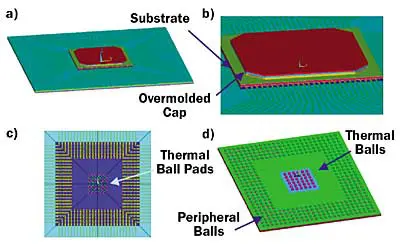 Figure 1. Exterior views of solid model. a) Package and test board. b) Detail of package and board. c) Detail of test board: pads and traces for peripheral balls; pads for thermal balls. d) Underside of package showing peripheral and thermal balls.Figure 2 contains a number of views of the solid model with all the dielectrics hidden; i.e., only the chip and the metal features of the package substrate and the test board are visible. Only the cases with the board containing two planes are shown. The illustrations indicate that there is a continuous metal connection between the die mounting structure down to the top plane of the board by way of thermal vias in the package and the board. The peripheral balls are connected to surface traces on the board and form a separate thermal path.