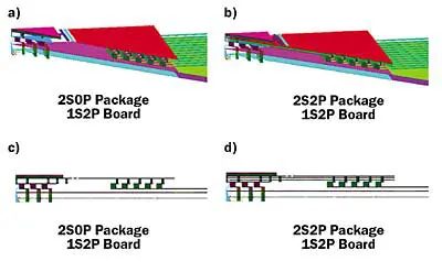 Figure 2. Views of 1/8 solid model with dielectric layers hidden. Packages with no and two internal planes. Test board with two planes in all cases. a) and b) perspective view. c) and d) side view.Note that in the case of the low conductivity board analyzed here (not shown), the thermal balls of the package are simply mounted to isolated metal pads on the board. Neither the thermal vias nor the planes in the board are present in the board.