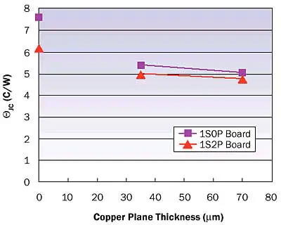 Figure 4 shows a graph of ΘJC versus the thickness of the package planes. It indicates the effect of the board construction on all of the package variants analyzed. As in the example above, the 2S2P packages manifest a fairly small impact of the board construction. The change in ΘJC due to the effect of the board varies from a low value of 6% for the package with 70�m planes to a high value of 7% for the package with 35�m planes.