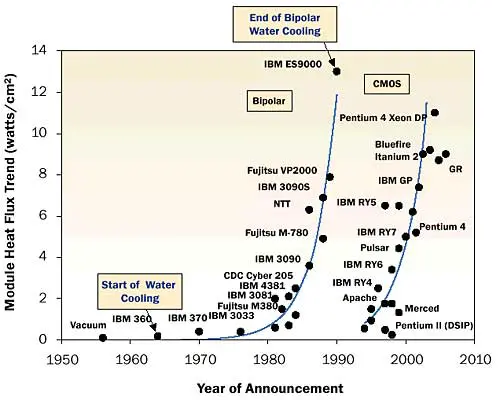 Figure 2. Module heat flux trend. Module powers shifted by ~10 years from bipolar to CMOS.