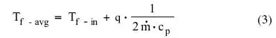The convective thermal resistance is assumed to be between the temperature at the surface (which is treated as if it is isothermal) and the average bulk temperature of the fluid flowing over the surface. Invoking the first law of thermodynamics (i.e., conservation of energy) the average bulk temperature of the fluid, Tf-avg, is equal to the inlet fluid temperature plus one-half the total temperature rise in the fluid as given by