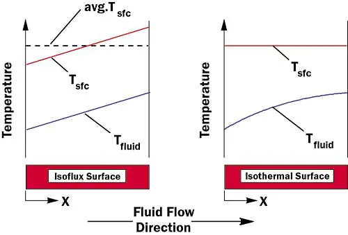 For the isoflux case the heat input per unit area is constant as the fluid moves along the surface. As a result, the rate of increase in the average bulk temperature of the cooling fluid with respect to flow length X is constant as it moves along the surface, resulting in a linear temperature profile for both the fluid and the surface. In this case the average surface temperature is exactly that given by equation (3). For the isothermal surface case, as the fluid moves along the surface and heats up, the temperature difference between the surface and the fluid will begin to decrease and so will the heat flux at the surface.