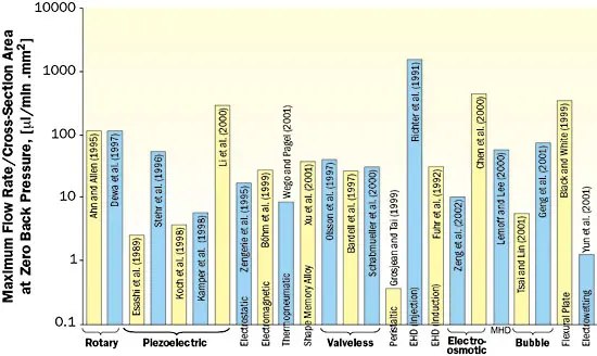 Figure 1. (a) Maximum flow rate per unit cross-sectional area at zero back pressure, and (b) maximum back pressure at zero flow rate for various micropumps in the literature [3].Among the micropumps in the literature, the highest pressure heads were reported for vibrating diaphragm micropumps with check valves, electroosmotic pumps, and valveless micropumps using nozzle-diffuser elements, in this order, (see also Figure 1b). If the power input to the micropump is a constraint, electrowetting micropumps are ideal because they have the lowest power requirement per unit flow rate. Vibrating diaphragm micropumps using electrostatic actuation also have low power requirements. Moreover, vibrating diaphragm pumps operating specifically at the resonant frequency of the system have the potential to achieve very high flow rates per unit power input.