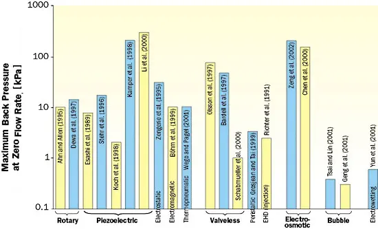 A quantitative comparison of the various micropumps for which quantitative descriptions were available is presented in [3]. The pumps are compared based on their maximum reported flow rate per unit area, maximum achievable back pressure, voltage, power input, and frequency of operation for peak performance. To illustrate the potential of different pumps graphically, the maximum flow rates per unit area as well as the maximum back pressure are plotted in Figures 1a and 1b, respectively, for the pumps reviewed in [3]. In general, the pumping techniques using surface effects, such as electroosmosis and flexural plate waves, perform better in terms of flow rate per unit area. However, these pumps use very shallow channels to maximize surface forces. On the other hand, in a microchannel cooling system, channel depths would be much larger and surface effects not as dominant.