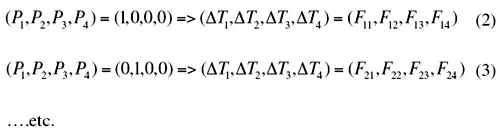 Once the influence coefficients are determined in this way for all four the chips, the temperature rise of any chip may be calculated for an arbitrary power combination using the following equation