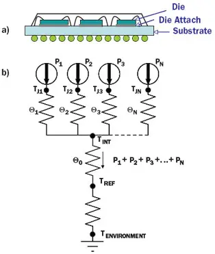 This article will focus on a “lateral” MCP, namely, one in which all the chips are located in the same plane. Another family of MCPs, namely those employing stacked chips, is also popular, but that is another discussion. The reader is referred to a previous column on this subject for a comparison of lateral and stacked MCPs [2]. Figure 1 illustrates a lateral MCM and a simplified thermal resistance diagram that captures the essential physics of heat flow and temperature variations within the package. It shows the heat from all the chips flowing into a common region, usually internal to the package, with temperature TINT. TINT is a function of the total heat generated collectively by all of the chips. Each chip experiences a further temperature increase with respect to TINT, which is proportional to the power applied to that particular chip. Even when a chip is not powered, its temperature will be elevated by the power applied to the other chips. Hence, the temperature of any of the chips is a function of the power applied to all of the chips. This is an inescapable reality in the thermal analysis of MCPs. (Note: The thermal resistance diagram is intended to illustrate the heat flow paths and not to be rigorous. For example, it does not account for the thermal gradient in the common region.)