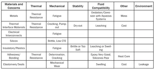 A wide spectrum of compatible materials (metals, semiconductors, ceramics, plastics, composites and possibly dielectric fluids) are required for robust automotive thermal cooling systems. Many unusual materials with specific properties are required to provide critical performance functions including thermal conduction, insulation, fluid transport, surface passivation, bonding and sealing, structural support or low friction interfaces. Careful selection of these materials on the basis of cost, performance, stability and mutual compatibility requires a detailed understanding of their thermal, mechanical and chemical characteristics.