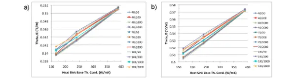 Figure 3. Plots of a) junction-to-case and b) junction-to-sink thermal resistances vs kHS at specific values of wHS and hEFF.
