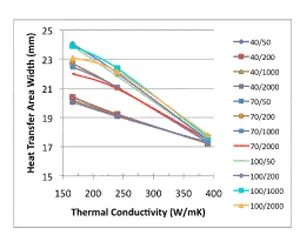 Figures 6a and 6b depict the “corner cases” representing maximum heat sink performance (6a) and the minimum performance (6b) studied for that value of wHS. Specifically, Figure 6a assumes the copper heat sink at hEFF = 2000 W/m2K and Figure 6b assumes the lower conductivity Al alloy heat sink at hEFF = 50 W/m2K. Varying the width of the heat transfer area (HTA) has the expected result on THS,PEAK. As the HTA width is reduced from 40 mm to 13 mm, THS,PEAK increases significantly. It is notable the change in ΘSA is most significant for the copper heat sink with the high value of hEFF. It is approximately equal to ± 0.05 ˚C/W about the mean value of 0.18˚C/W, or nearly ±30%, a significant effect. In contrast, for the Al alloy heat sink with the relatively low value of hEFF, the variation in ΘSA is only ± 0.3˚C/W or ± 5%. This should not be surprising since the low value of hEFF ensures that the convective contribution to the total value of ΘSA will be much larger than the conductive contribution.