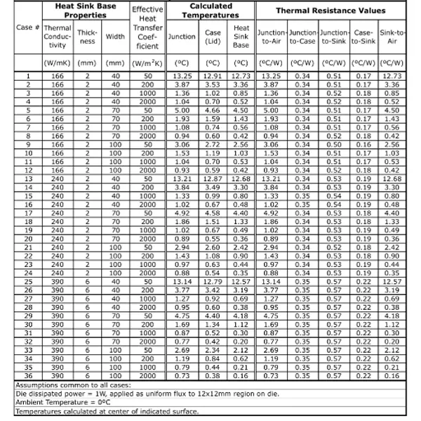 Table 2 provides the calculated values of TJ, TCASE, and TSINK and the values of thermal resistances calculated from these temperatures and TA: ΘJA, ΘJC, ΘJS, ΘCS, and ΘSA for each of the 36 cases studied. The following discussion elaborates on each of these thermal metrics.