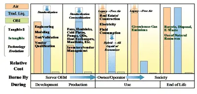 It has been said that datacenter operations are all about cost, cost, cost. Its costs money to develop, manufacture, house and operate a thermal management solution. Less tangible environmental costs like greenhouse gas emissions, natural resource consumption and e-waste are becoming increasingly important to society. Open bath immersion (OBI) cooling technology appears able to have a dramatic effect on both financial and environmental costs in all stages of a server’s life cycle (Figure 4). Its investigation continues through long term demonstrations that will track thermal performance, serviceability, fluid health, fluid loss, etc.