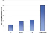 While there is a large amount of fuel on-board an aircraft, its use is not evenly distributed over the flight envelope. During ground idle and idle-descent the fuel flow is very low. During take-off it is extremely high. Thus the fuel flow to the combustor nozzles rarely matches the electrical loss removal demands required by an MEA. For instance, an aircraft electrical system often requires significant cooling during idle-descent when electrical loads are relatively high (actuation of flight control surfaces), but fuel flow is extremely low. To meet the cooling requirements, it is often required that the fuel is circulated back into the fuel tank after being used for cooling. This return-to-tank arrangement is common on military platforms. Using the fuel tank for thermal energy storage is convenient, but also has its limitations. At the beginning of the mission the hot fuel returning to tank does not significantly increase the overall temperature of the fuel in the tank because of the large thermal mass available. As the mission progresses and fuel levels are reduced, the high temperature return fuel has an increasingly greater effect of raising the temperature of the fuel in the tank. The latest military aircraft, and presumably future aircraft [6] (Figure 4), have such high cooling demands that even with the return-to-tank arrangement, the fuel simply does not have enough cooling capacity and alternative options such as fuels with improved thermal stability and refrigeration of fuel prior to take-off are being explored.