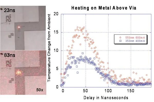 In order to test sub-nanosecond thermal imaging capability at small scales, a sample of test vias was used. Small vias can heat rapidly, and one can observe the heat diffusing into the metal. To detect the small change in reflection in very short times, active devices are thermally cycled and characterized with pulsed illumination and a boxcar averaging circuit. Thermal images are obtained for single vias which are 350nm and 550nm in diameter. The 550nm via is heated by pulsing currents up to 600mA at 50ns. While this is a high current density (~2×108 A/cm2), the low duty cycle reduces the total power dissipation. Figure 1 shows the thermal images of a 550nm single via at 23ns and 83ns delay. During turn-on the temperature field is very localized near the via, however after turn-off the heat begins to diffuse into the metal. By using a small region, 25 pixels, in the thermal image one can step through the image series and determine the average temperature on top of the metal where the via is buried. The graph in Figure 1 shows the temperature for two different via sizes for the first 200ns, with a 50ns excitation pulse. The peak temperature is actually higher than the average presented. The red curve from the 550nm via was acquired at only 10sec per frame averaging, so that the entire curve was acquired in less than an hour. The blue curve from the 350nm via was acquired with 30sec averaging per frame, about 3 hours total. The advantage of the extra averaging is seen in the tail of the curves, where the blue trace shows less noise. The temperature sensitivity can be estimated at about 1°C, for a 30sec average.