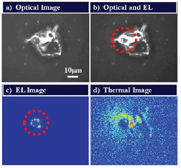 In order to identify and characterize various defects in thin-film amorphous-Si and copper indium gallium selenide (CIGS) solar cells, the device can be applied forward bias or applied reverse bias and thermal imaging can be performed. Typically lock-in infrared thermometry is used, which has micro Kelvin temperature resolution but the spatial resolution is limited to a few microns and one cannot detect visible light emission with the same long wavelength cameras. In the case of thermoreflectance it is possible to do simultaneous imaging of the visible electro-luminescence (EL) and the temperature distribution [11]. In this setup, we used a megapixel silicon-based CCD. EL can be indicative of pre-breakdown sites due to trap-assisted tunneling and stress-induced leakage currents. Many defects can be found through electroluminescence due to direct recombination. In solar cells, these EL defects are typically sites of avalanche breakdown and emit white light that can be detected by a silicon CCD. Figure 2 shows an avalanche defect with visible EL. Since the response time of the heat diffusion is very different from the electroluminescence response, we are able to separate the two effects using the same transient thermoreflectance imaging camera.