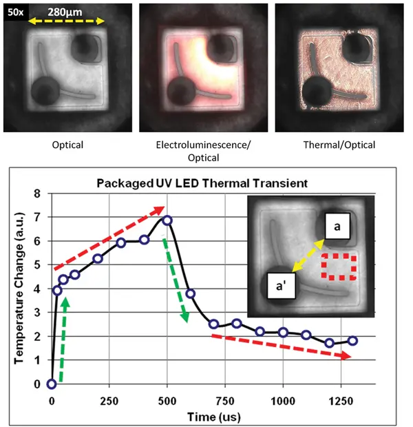 Non-uniformity of light emission within the active area of an LED device can be detected by an image sensor. Since LED devices are very sensitive to temperature thermal characterization of the active device provides useful information under both the steady-state and transient operations. Also, the details of temperature distribution are important to identify potential defects. Separation of the light emission from the device and the thermoreflectance signal is performed using a transient differencing algorithm and a precisely controlled phase delay [12]. Figure 3 shows the transient response to a step pulse drive current. The quick response of the metal surface is shown on the rising edge of the thermal transient (green arrow) within 25μs. The slower thermal transient of the package is shown by the red arrows.