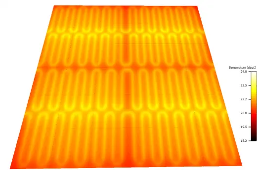 I haven’t got a infrared thermography imaging camera so can’t provide an exact side by side comparison of my model and my extension. The best I could come up with is this typical IR image of a similar floor. Note my model doesn’t (yet) include the effects of walls. Think of it as a section in a much wider floor so it doesn’t show the cold edges. There is the same results colourmap available though to aid in such real vs. simulation comparisons: