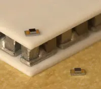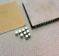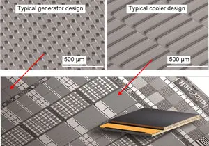 Figure 6 illustrates the size ratio of the smallest produced thin film TE cooler, featuring a cold side area well below 1 mm2, versus a legacy thermoelectric Peltier cooler: the thin film cooler easily fits on a single leg of the legacy bulk TEC. Across its effective leg height of as little as 36 µm the sputtered thermoelectric structure can establish an effective temperature difference of more than 60 K down from a hot side of 85°C. The same gradient across a 0.5 mm high TE leg would, theoretically, result in a ΔT of 850K. Theoretically, as 80% of the temperature difference of a legacy TEC is achieved along less than 5% of its respective height.