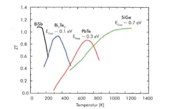 The maximum value of ZT is found around 1 for most thermoelectrically active materials actually used, due to physical effects at the level of the crystalline lattice of those materials. Since the electrical conductivity of a good thermoelectric material should range somewhere between a metal and an insulator, it is not much of a surprise that almost all high performance thermoelectric bulk materials are semiconductors. ZT shows a material characterizing temperature dependency with a peak in a fairly narrow temperature range, found at levels between 100 and more than 1000 K (Figure 1). In order to obtain a higher ZT value for more efficient power generation, a high Seebeck coefficient S is required. This calls for a low thermal conductivity of the thermoelectric materials. Accordingly, the math for coolers demands that effective thermoelectric materials need to have a high Seebeck coefficient S, i.e. a high electrical conductivity and a small thermal conductivity at the same time. This, however, conflicts with the Wiedemann-Franz law [2] linking a higher electrical conductivity proportionally to a higher thermal conductivity.