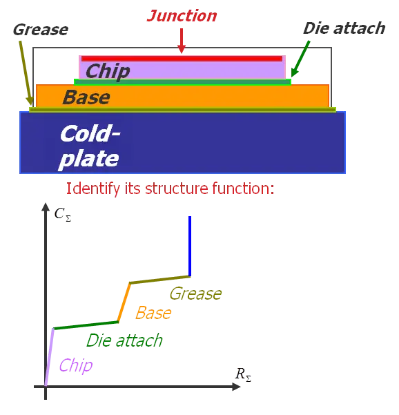 The structure function is shown graphically as a graph of thermal resistance vs. thermal capacitance the heat experiences as it travels from the junction (origin) to the surrounding ambient.