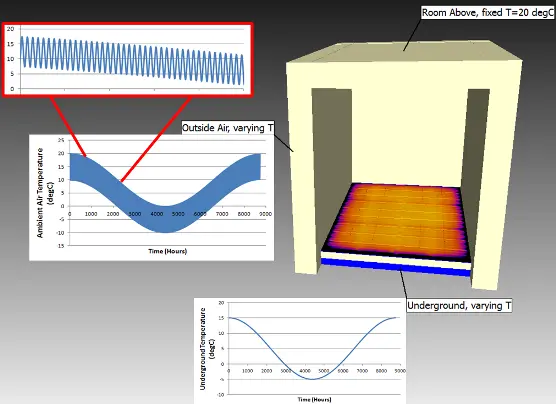 When constructing a simulation model one has to determine the extents of that model. The demarcation between what you intend to simulate and what you will assume. From a heat flow perspective this normally translates into an ‘inside’ that is modelled explicitly and an ‘outside’ that isn’t modelled, rather its effects imposed by some ‘boundary condition’ (BC), an apt phrase if ever there was one. From an electronics cooling perspective there are well defined levels where such BCs can be readily imposed. The same is true from an HVAC perspective, one of the best posed interfaces lies between the built environment and mother nature outside. To determine the effectiveness of undermat thermal insulation I opted to build a simple model of a single room in FloTHERM (though I could have done the same in FloVENT) to investigate the power consumption requirements of the heating mat during seasonal external variations.