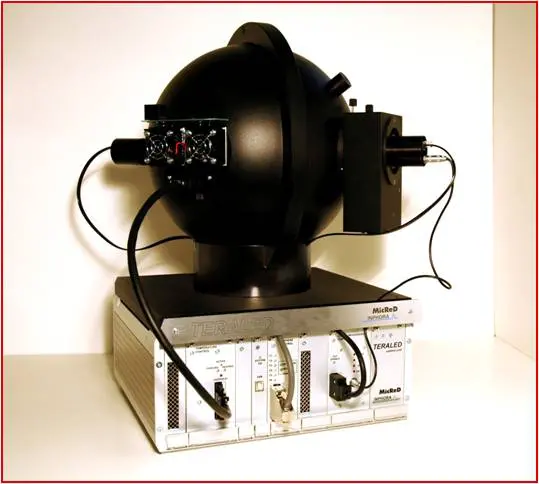 Thermal simulation is now such an inherent part in the design of this and other electronic products that the provision of thermal metric data by the supplier is common place and expected. Some metric data will be used for comparison purposes only, other data will be expected to be used accurately in simulation. Such data normally exists in the form of thermal resistances, K/W (degC/W). That is the temperature rise of the package for a given power dissipation. That’s to say the power that is dissipated not as light. How would you measure that? Why, you’d need some kind of optical integrating sphere.. ta da! Picture on the left is a product called TERALED available in conjunction with the T3Ster measurement system that will measure both thermal and optical properties of the DUT (device under test).