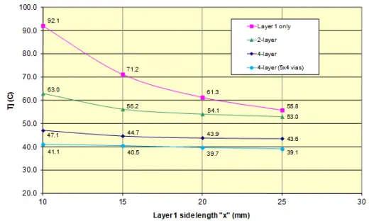 Now we’ll add some internal copper planes (4-layer curve in dark blue). As might be expected, the temperatures have come down even further, and the shape of the curve indicates even less dependence of TJ on top copper area. In fact, the percentage reduction in TJ when going from x = 10mm to x = 25mm is only around 7.5%.