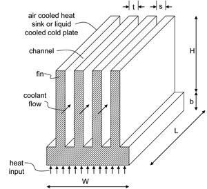 The important equations from the preceding analytical treatment that can be used by the thermal designer are eqs. (7), (8), (10), (11), and (14) which can lead to the calculation of thermal resistance for a heat sink design that would satisfy flow rate and pressure drop targets. In addition, the designer would have to specify a fin material (e.g. copper or aluminum), a coolant (e.g. air or water), a heat sink volume (L, W, H), the base thickness (b), and the number of channels (N). The last parameter, N, can be changed parametrically to yield multiple designs that satisfy the target constraints, and a design can be chosen based on the thermal resistance (R) as well as what fin thickness and channel spacing are manufacturable.