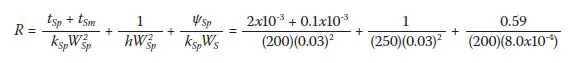 The benchmark calculation for Case 1 uses rectangular device spreading theory from Ellison to obtain the dimensionless source center and source-averaged spreading resistances ψSp = 0.59 and ψAve-Sp = 0.50, respectively [5]. Theory shows that the maximum total thermal resistance from the source center to ambient is the sum of terms for one-dimensional conduction, uniform h convection, and spreading [5]: