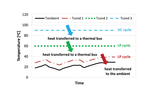 The results showed a much higher temperature for the secondary fluid at the outlet of the condenser when using the VC system, which is related to the higher condensing temperature. This implies that a higher economic value is obtained for the waste heat available in the condenser. In Europe in particular, many cities have district heat lines (even the small city of Lausanne) and they are potential consumers for the waste heat.