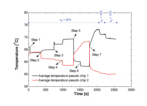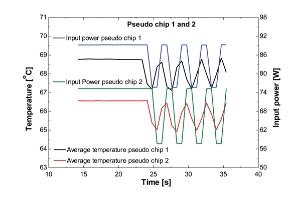 The heat loads on ME1 and ME2 were varied between 90 W and 75 W and 75 W and 60 W, respectively, with a periodic disturbance time of 1.4 s (emulating a fast and periodic change in the pseudo-microprocessors’ clock speed). Figure 5 shows the input power disturbance on the pseudo chips and the effect on the average temperature of each chip. The maximum temperature variation is only 1.5 °C, which is acceptable when compared to the temperature gradient along the chip for on-chip single-phase cooling using water (about 2-3 K for a uniform heat flux and without heat load disturbance [10]).