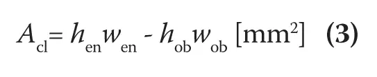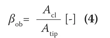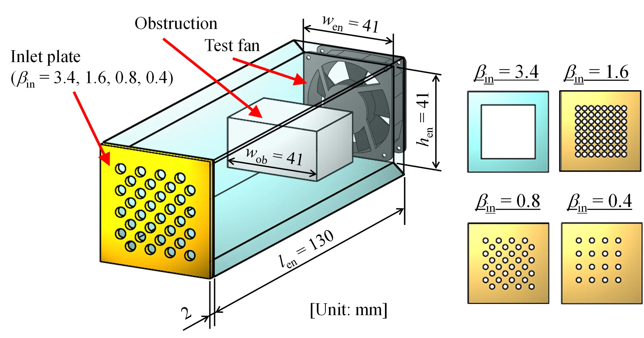 Figure 4 and Table 3 show the details of the obstruction mounted in the enclosure. To simulate the actual electrical components in electronic equipment, a rectangular obstruction was mounted in front of the fan while changing the dimensions of the obstruction and the mounting position. Here, the ratio of flow passage area Acl divided by the fan flow area Atip is defined as the flow area ratio bob. Here, Acl is defined as: