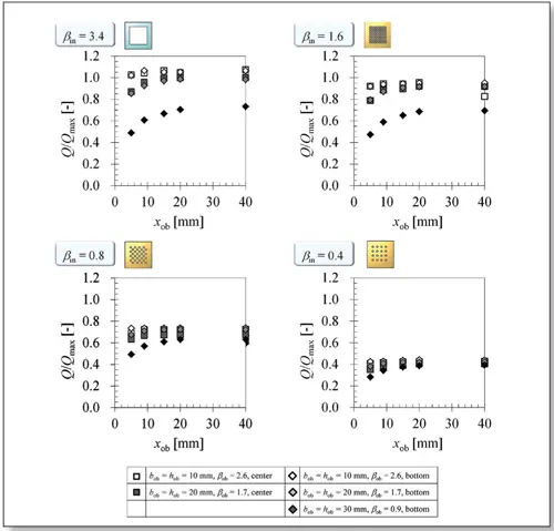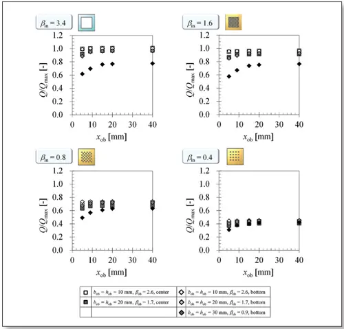 Here, when the dimensions of the obstruction become larger, the distance between the fan and the obstruction xob also affects the supply flow rate; the supply flow rate decreases when the position of the obstruction is near the fan. We previously reported that the fan performance itself deteriorates when the large obstruction is mounted in front of the fan [6]. In this case, the large obstruction affects the inlet flow to the fan and the fan performance itself may be deteriorated. In order to predict the correct supply flow rate regardless of the deterioration of the fan performance, the further investigation about the relationship between the obstruction near the fan and the fan performance should be additionally investigated.