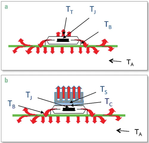 When no heat sink is attached to a package, in a typical system, the dissipated heat is removed from the package and its associate printed circuit board (PCB) by a convection process (either natural or forced) supplemented by radiation cooling. Since, typically the PCB has a much larger surface area than the top of the package, most of the heat flows to the air via the PCB, as illustrated in Figure 1a. The figure identifies the relevant temperatures and their location to be used for calculating the appropriate thermal metrics, as described in the previous column. These temperatures are measured at the following locations: incoming air (TA), package top center (TT), board (TB), and the junction (TJ).