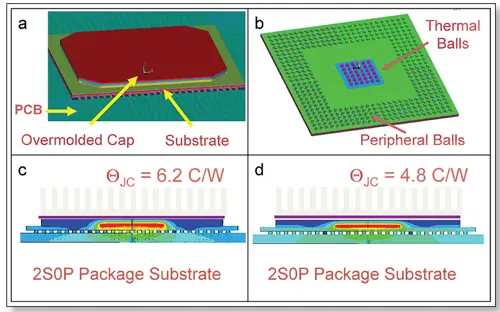 Figures 3a and 3b illustrate the construction of the package. Figure 3a shows a top view closeup of the package attached to a PCB. The substrate is shown with the overmolded cap covering the IC. When the heat sink contacts the package, it is pressed against the top surface of this cap. The cap is made of low-thermal-conductivity molding compound, which makes a significant contribution to the measured value of QJC . Figure 3b depicts the peripheral rows of solder balls that connect to the surface traces of the test board and the 6 x 6 array of thermal balls that are routed by vias to one of the two internal planes in the board to further enhance the thermal performance of the package. Figures 3c and 3d show the results of simulations of the QJC test with each of the two package configurations.