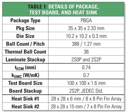 Two different package configurations are evaluated: The first with two metal layers on the top and bottom surfaces of the package substrate. These are both signal layers. There are no metal planes. This nomenclature to describe this substrate stackup is: 2S0P. The second has two metal planes in addition to the two signal layers of the previous package. These planes provide much more efficient lateral spreading of heat than do the discontinuous signal layers. The stackup of this substrate is typically referred to as 2S2P. The thermal performance of the 2S2P package was studied in the previous column. Other details of the packages, test board, and heat sinks are provided in Table 1.