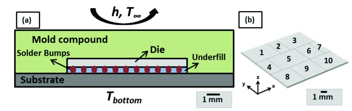 First, the entire package including chip, substrate, mold compound, and solder bumps is numerically modelled based on total chip power, boundary conditions, and initial conditions. At this level of simulation, chip is modelled as a solid block with effective material and thermal properties. No knowledge of chip internal features is required at this stage. Once the transient temperature distribution at package level is determined, POD model of the package is developed based on the chip power profile as previously explained. The POD model is able to predict dynamic temperature distribution for different power maps and types of power sources, without developing any further full-field finite element models [9]. This can considerably decrease computational cost and potentially be used to prescribe a criterion for the optimal distribution of the current density in the device. In the next step, a combination of heat flux and temperature on the surrounding walls of chip is extracted and applied in the form of dynamically changing boundary conditions for the chip level simulation. At this level, the chip is no longer treated as a solid block and is divided into subdomains called function blocks. Each block represents a component with unique functionality on the chip and consists of three sub-layers: 1. Silicon layer, 2. Transistor layer, and 3. Interconnect/Dielectric multilayer. The transient thermal solution at the chip level is then determined by assigning the block specific power profiles, thermal and material properties. Based on the desired spatial resolution, this approach can be continued to sub-chip level domains. In this article, the results of two levels (package and chip) is provided.