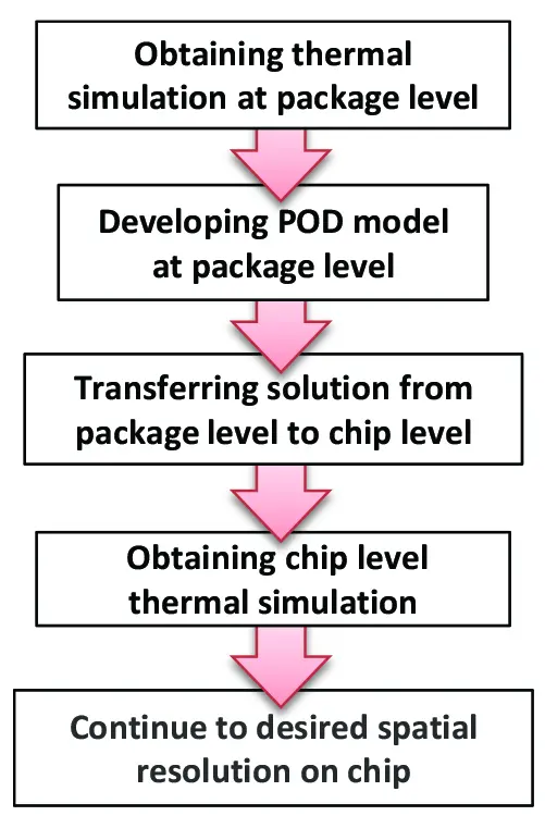 Progressive zoom-in is another multi-scale modelling technique that has been previously developed and can be used for transient thermal analysis in IC devices [15, 16]. Following a similar procedure described in [7],various levels of thermal behaviour in a system from package to chip, sub-chip, and ultimately transistor level can be integrated. This is done by passing down the acquired thermal knowledge of the system from each level to the following one through effective boundary conditions. By combining POD with progressive zoom-in approach, the computational efficiency of the hybrid model in covering several orders of magnitude in length and time scale is further improved. The overall hybrid approach for this work is shown in the flowchart of Figure 1 and is outlined below: