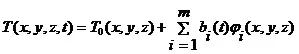 where T0 is the time average of temperature (i.e., the mean vector of the observation matrix), φi(x, y, z) is the i-th POD mode, and bi(t) is the i-th POD coefficient. Thorough derivation of a 2-D POD based reduced order diffusion model is provided in [9]. The 3-D formulation of POD method for conduction heat transfer is given in [11].