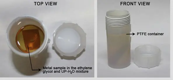 All fluid and test samples were placed in polytetrafluoroethylene (PTFE) containers which were cleaned with distilled water, alcohol, UP-H2O and dried in ambient atmosphere. PTFE containers were chosen over borosilicate glass because they contain strong, compact bonds which are excellent at maintaining their original crystallinity, therefore, exhibiting lesser ion leaching capacity to the base fluid. The containers were charged with either UP-H2O or EG-LC. Metal and polymer coupons were rinsed with distilled water, alcohol, UP-H2O and polished to remove excess surface debris. The materials were placed in the containers and sealed with PTFE thread tape and PTFE lids. The samples were allowed to equilibrate at room temperature for two days before recording the initial electrical conductivity. In all tests reported in this study fluid electrical conductivity was measured to an accuracy of ±1% using an Oakton CON 510/CON 6 series meter which was calibrated prior to each measurement. A furnace was preheated to 80°C in ambient atmosphere and verified for heating uniformity to ±1°C at different locations, i.e. from the wall heating coils to the center of the furnace. The PTFE sample containers were placed in the furnace when steady state temperatures were reached. The test setup was removed from the furnace every 168 hours (seven days), cooled to room temperature with the electrical conductivity of the fluid measured. The time taken for the samples to cool, measure electrical conductivity, and place back in the oven was generally less than four hours. The electrical conductivity of the fluid sample was monitored for a total of 5000 hours (~208 days).