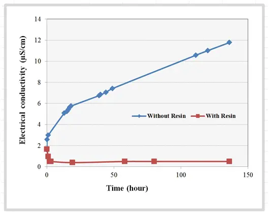 0.1g of Dowex resin was added to 100g of fluid samples that was taken in a separate container. The mixture was stirred and change in the electrical conductivity at room temperature was measured every hour.