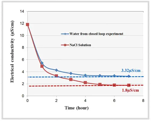 Similarly, closed loop test with ion exchange resin was carried out with the same cleaning procedures employed. The initial electrical conductivity of the 230ml UP-H2O in the system measured 1.84µS/cm. An ion exchange resin cartridge (diameter = 38.1mm, height = 50.8 mm) containing 20g of Dowex mixed bed resin was installed in the fluid loop.